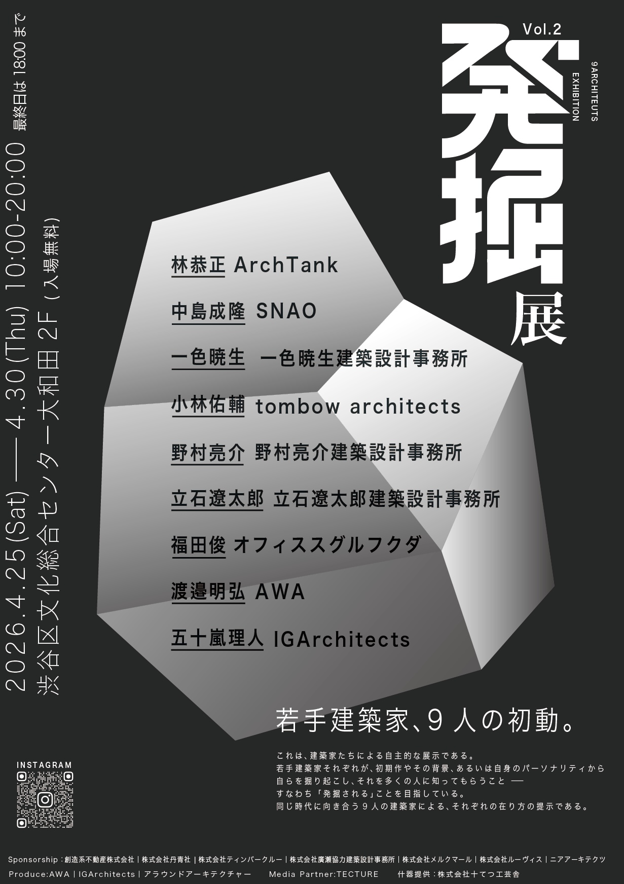 若手建築家9人が出展する展覧会「発掘展」を開催・出展します。