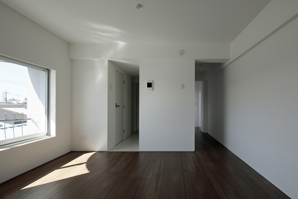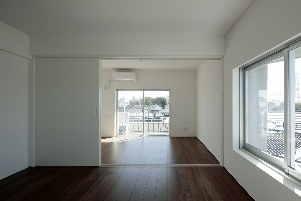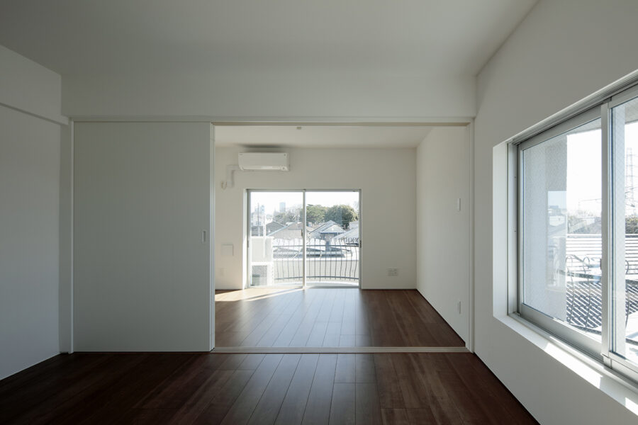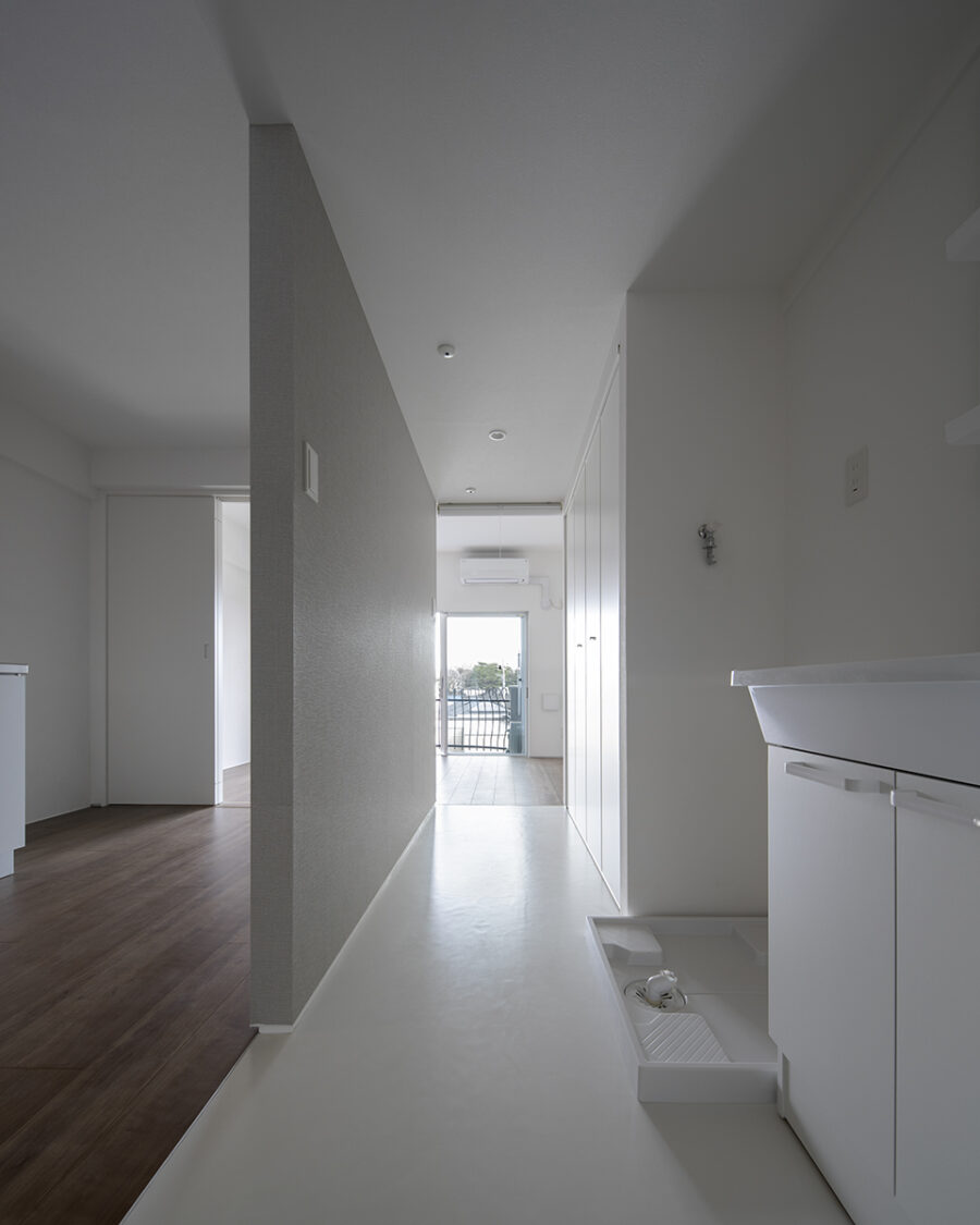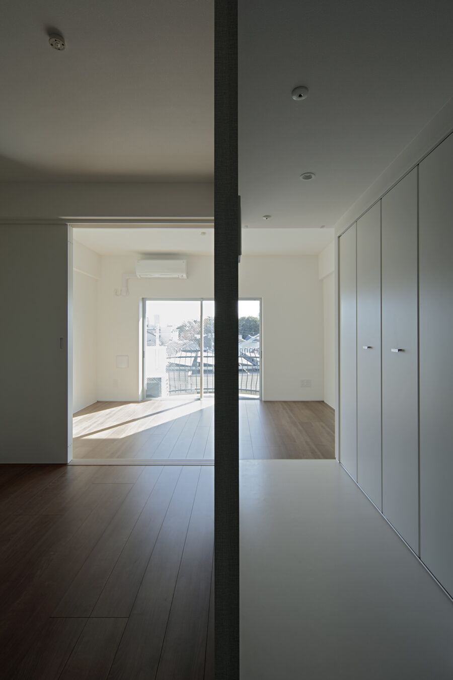 収益に直結する住戸計画は、既存の住戸割りを維持しつつ広い間口を活かし、回遊性や変化のある空間としています。寝室とユニットバスの動線上は、外の視線も気にならないパウダールームにもなっています。