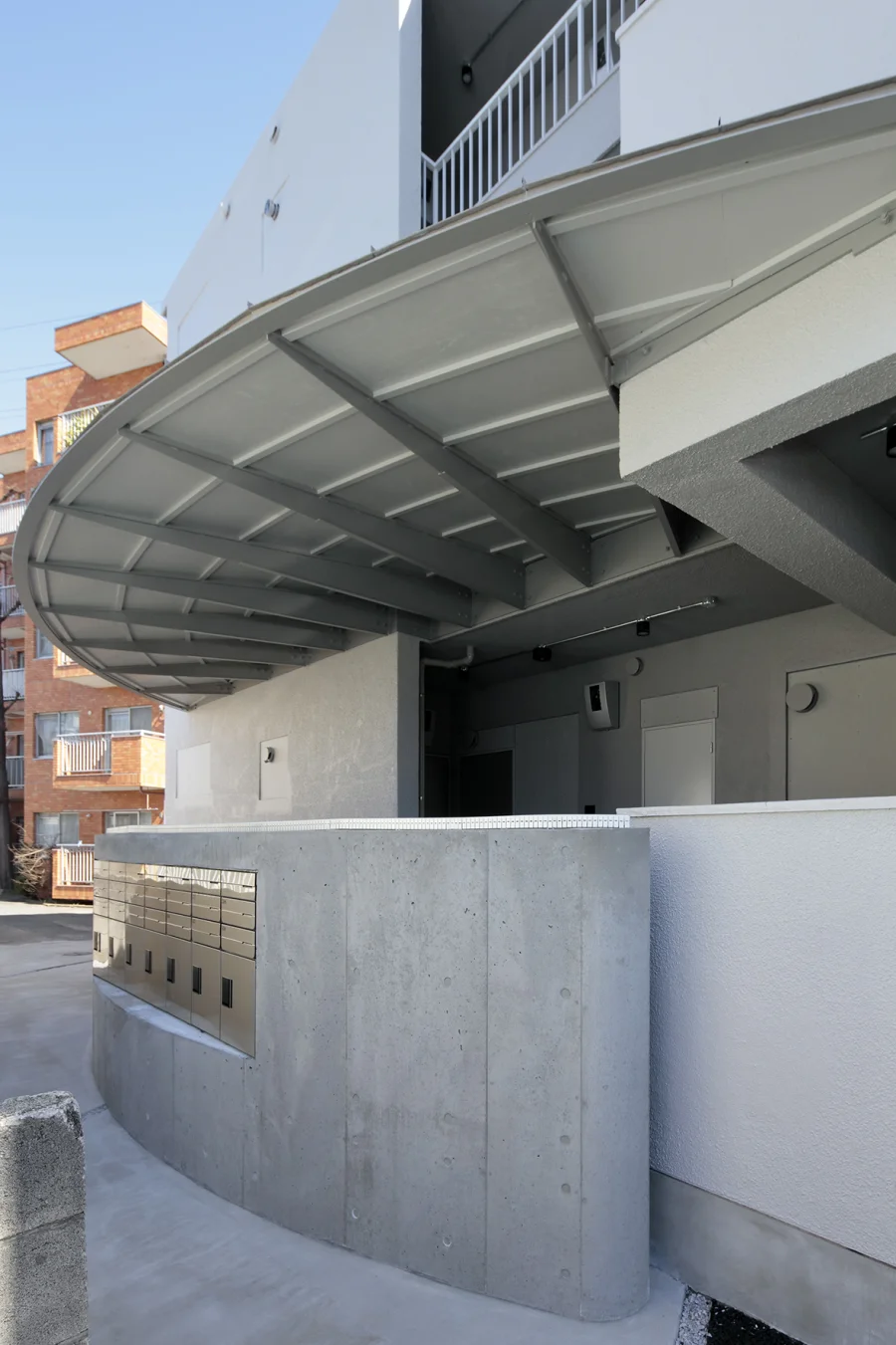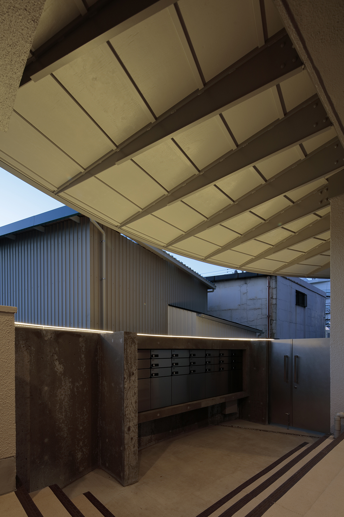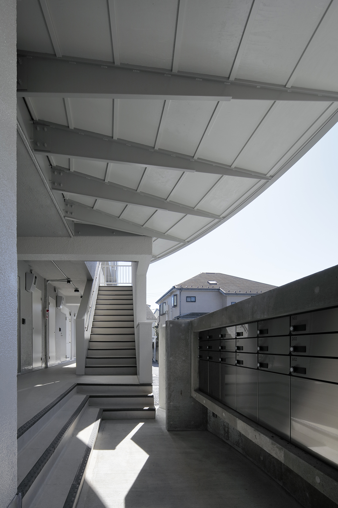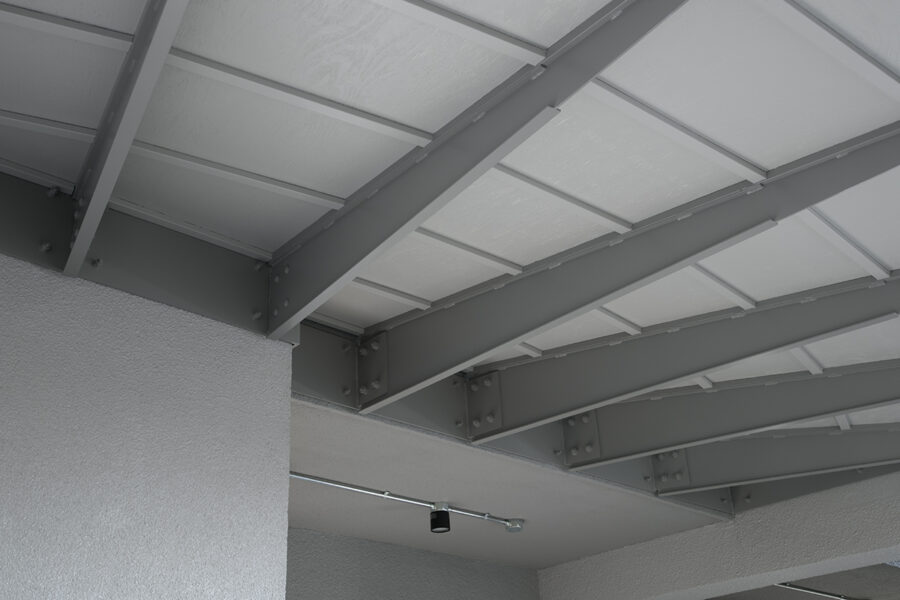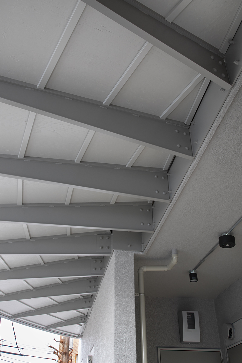 耐震性は、雑壁2の撤去によって、補強材を設置することなく自重の軽減のみで確保しています。新しい外皮は乾式構法を使用。軽量化しながら足し算や引き算の痕跡を残しています。新耐震の建物と同等の基準であるIs値0.6以上を確保し、更に第三者の評価である構造評定も取得しました。