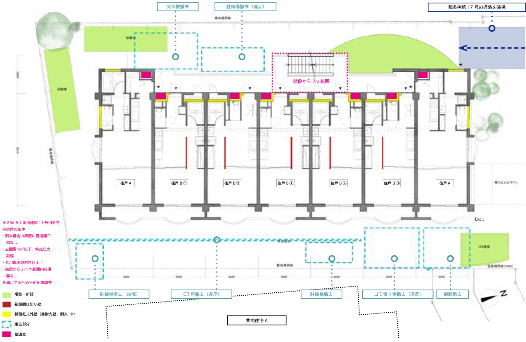 既存建物は、検査済証がなかったため、遵法性に疑問のある状態でした。そこで、設計前には入念な敷地・建物の調査を実施。検査済証がないものの建設時は法令に適合していたことを確認するとともに、過去50年の間に発生した違反箇所は、今回の計画で全て是正しました。