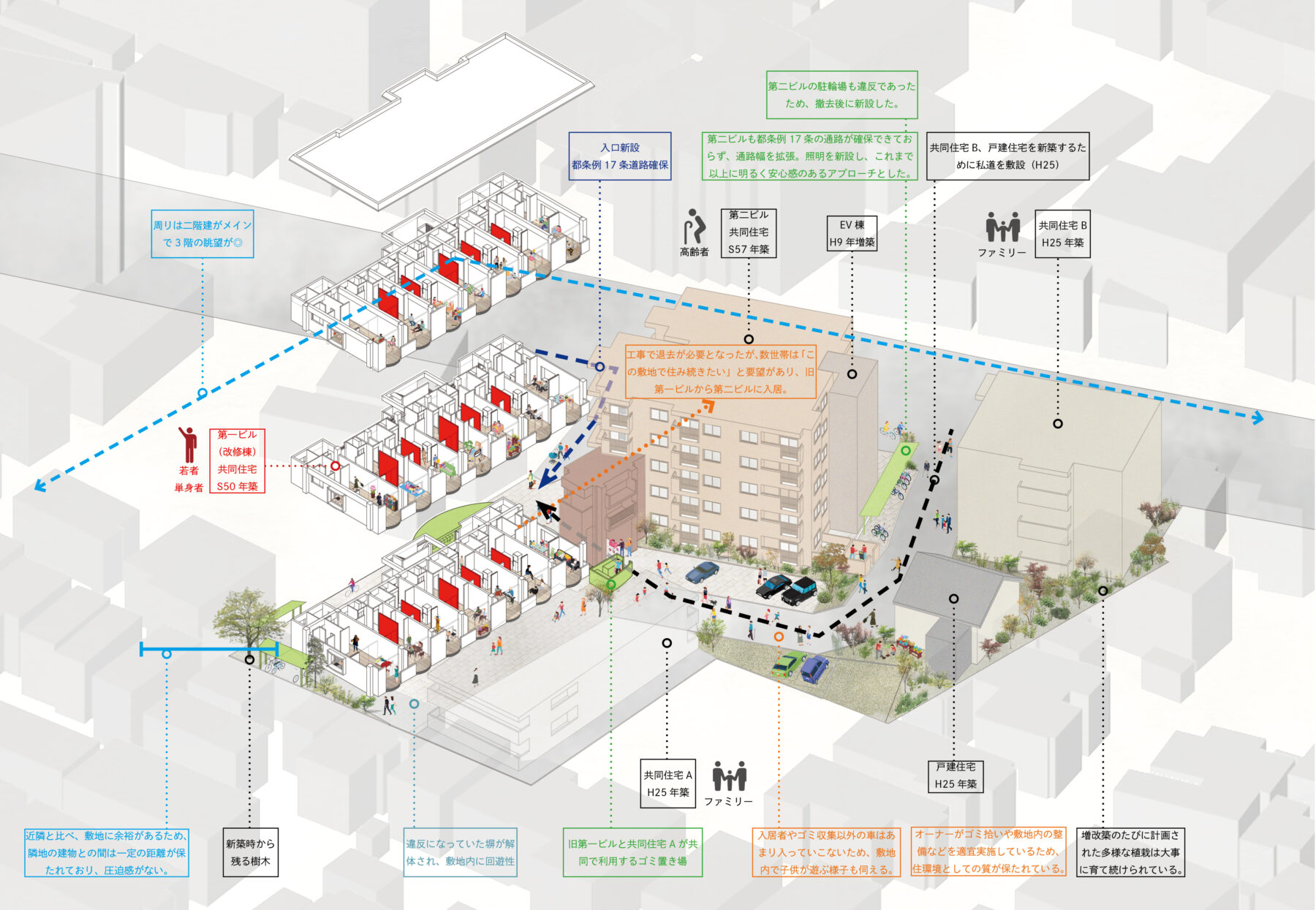 築古ストックの建て替えが進み急速に街並みが均質化しつつある住宅地で、耐震性や遵法性、融資付けといった築古ストック特有の問題を乗り越えながら、時間を経て得られる豊かさの補強と、そこに上書きするからこそ出来る建物のあり方を考えました。