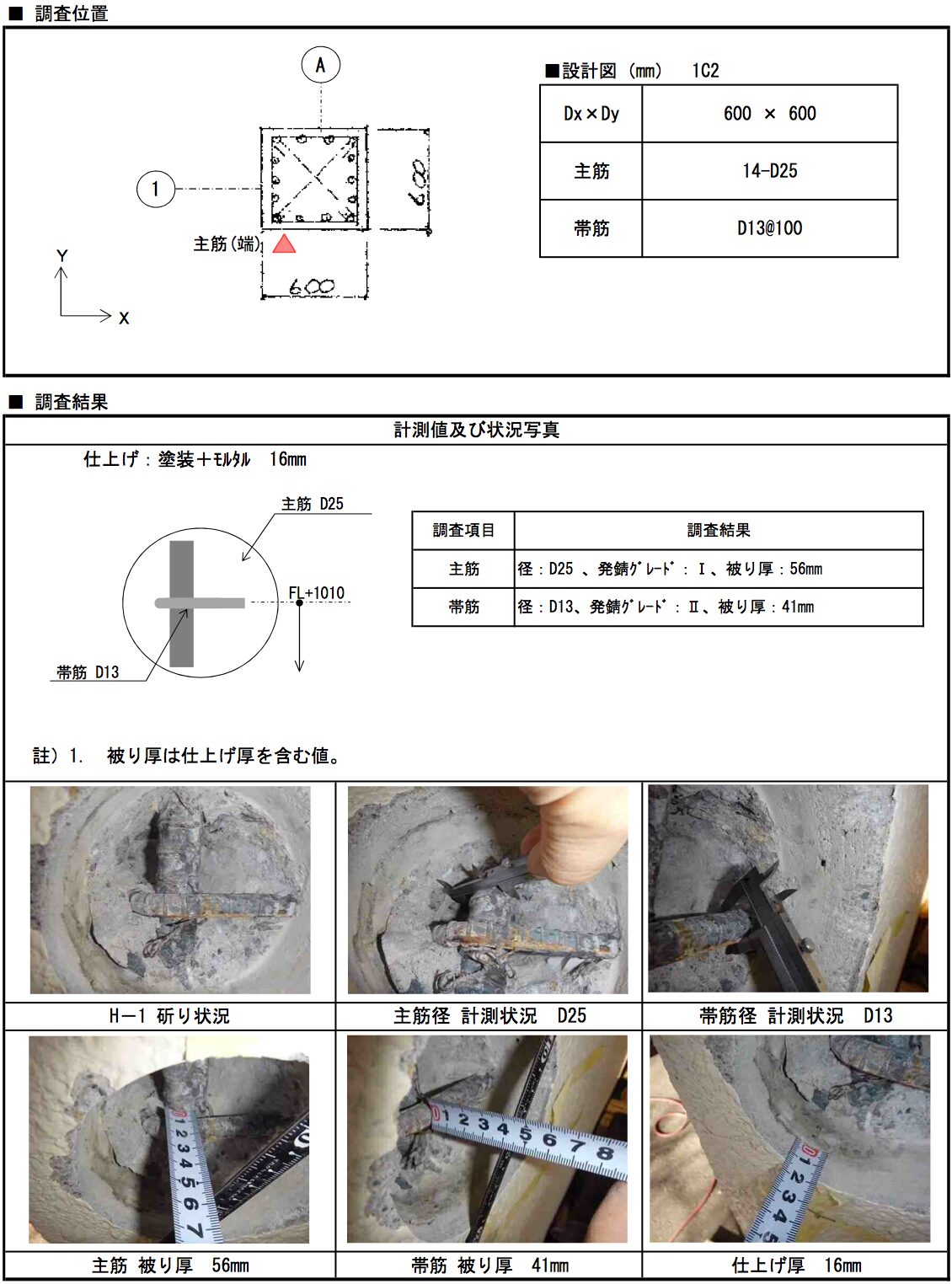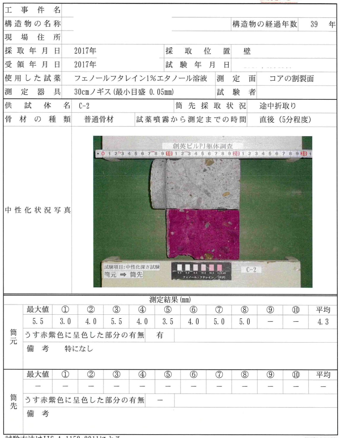 さらに上述した躯体の破壊検査によって、コンクリートの圧縮強度や中性化進度、鉄筋の状況といった構造図との整合性確認も行っています。