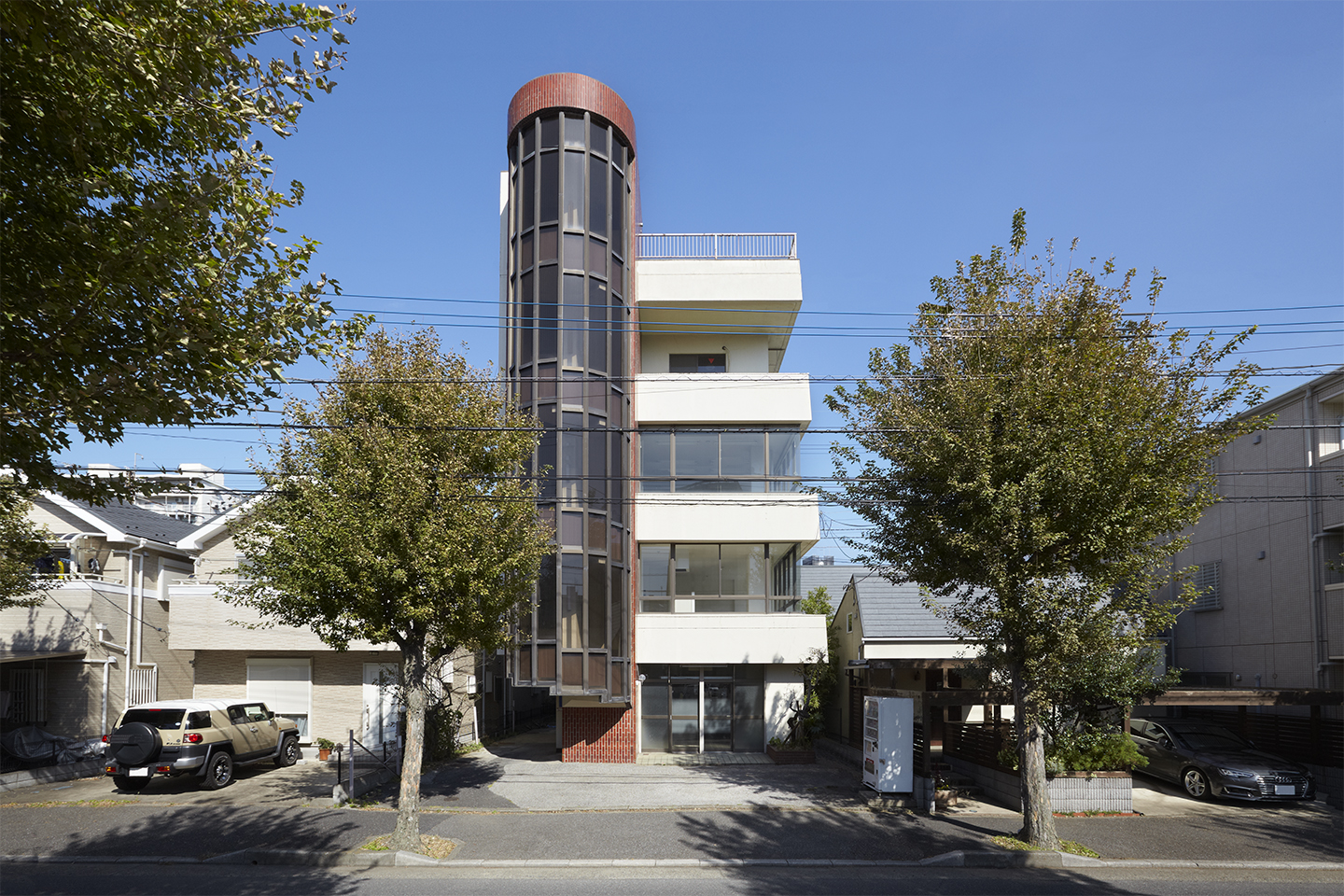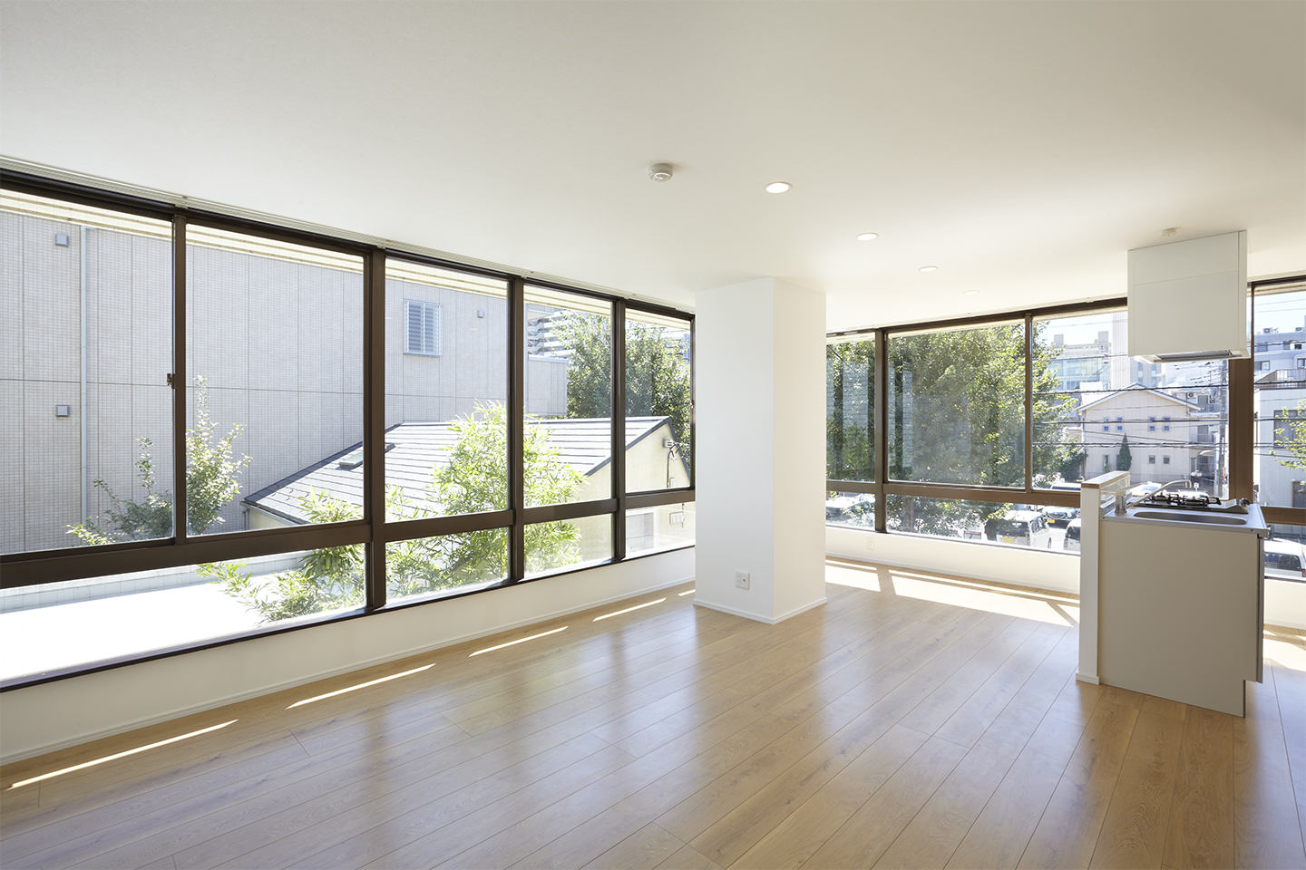 共同住宅に用途変更した2階と3階は、当初は事務所らしいつくりをしていました。具体的には、接道面の南側と低層の隣家が迫る東側で、キャンチレバーの外壁とほとんどフルハイトのサッシが開放的な空間をもたらしていました。