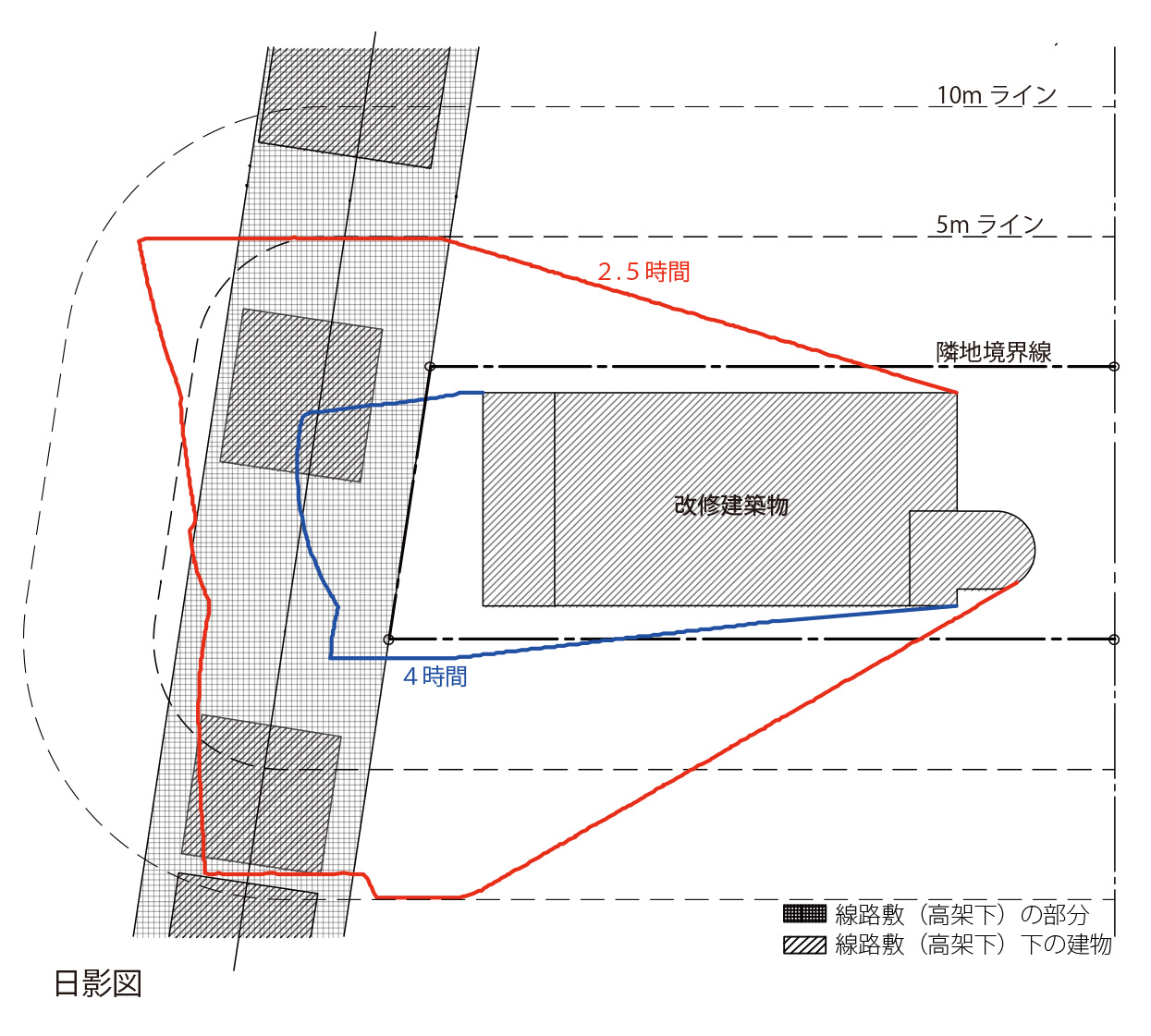 既存の建物は、日影規制に対して既存不適格の状態であり、建替えると高さや面積が大幅に縮小してしまう状態でした。上記の手続きを取ることは、新築では得られないヴォリュームを、遵法性を持って残すことを可能にしています。