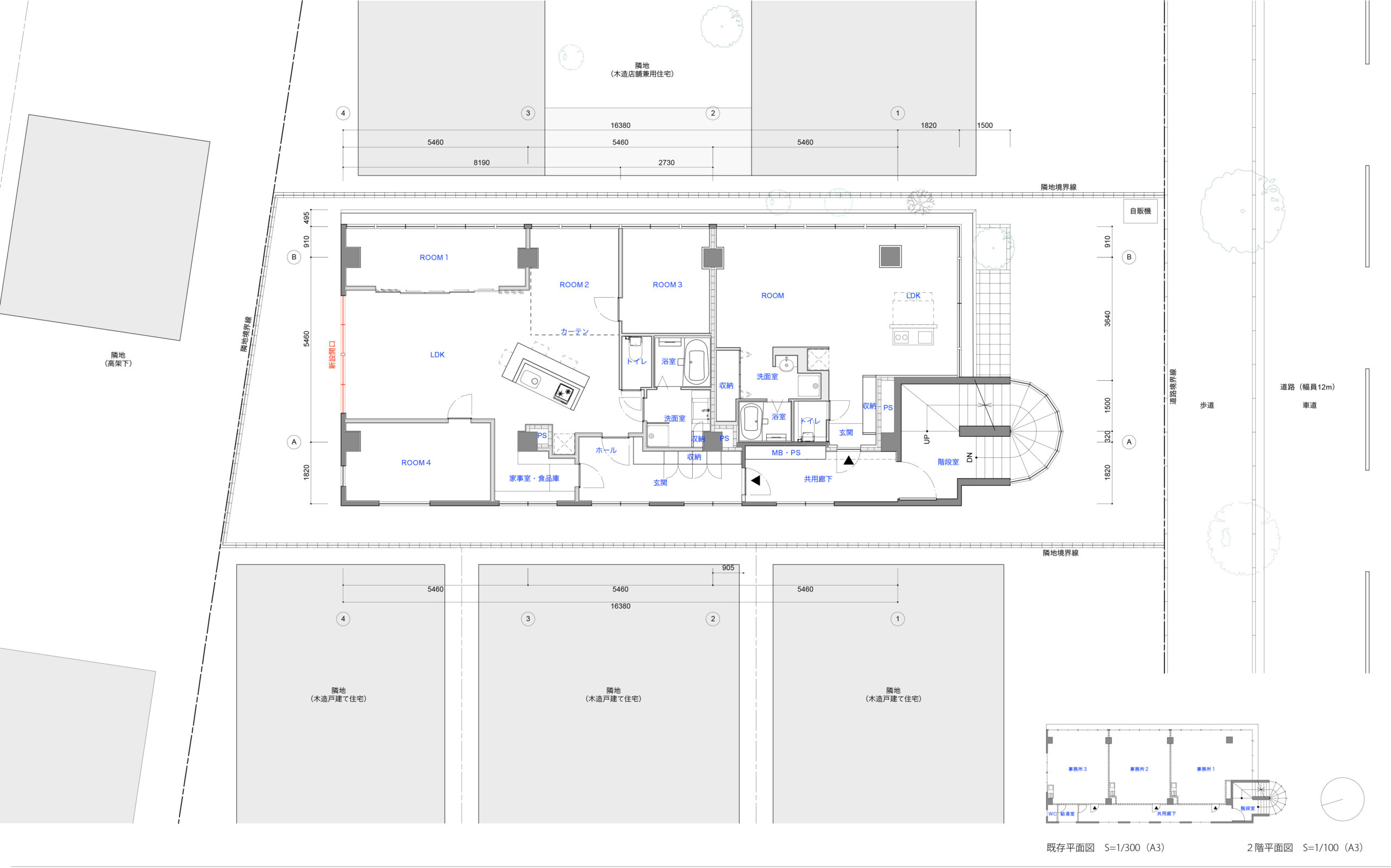 計画にあたっては、ニーズが薄れていた2階と3階の事務所を共同住宅にすることが主軸になりました。事務所を共同住宅に変更する部分が100m2を超えるため、用途変更の確認申請が必要となります。1