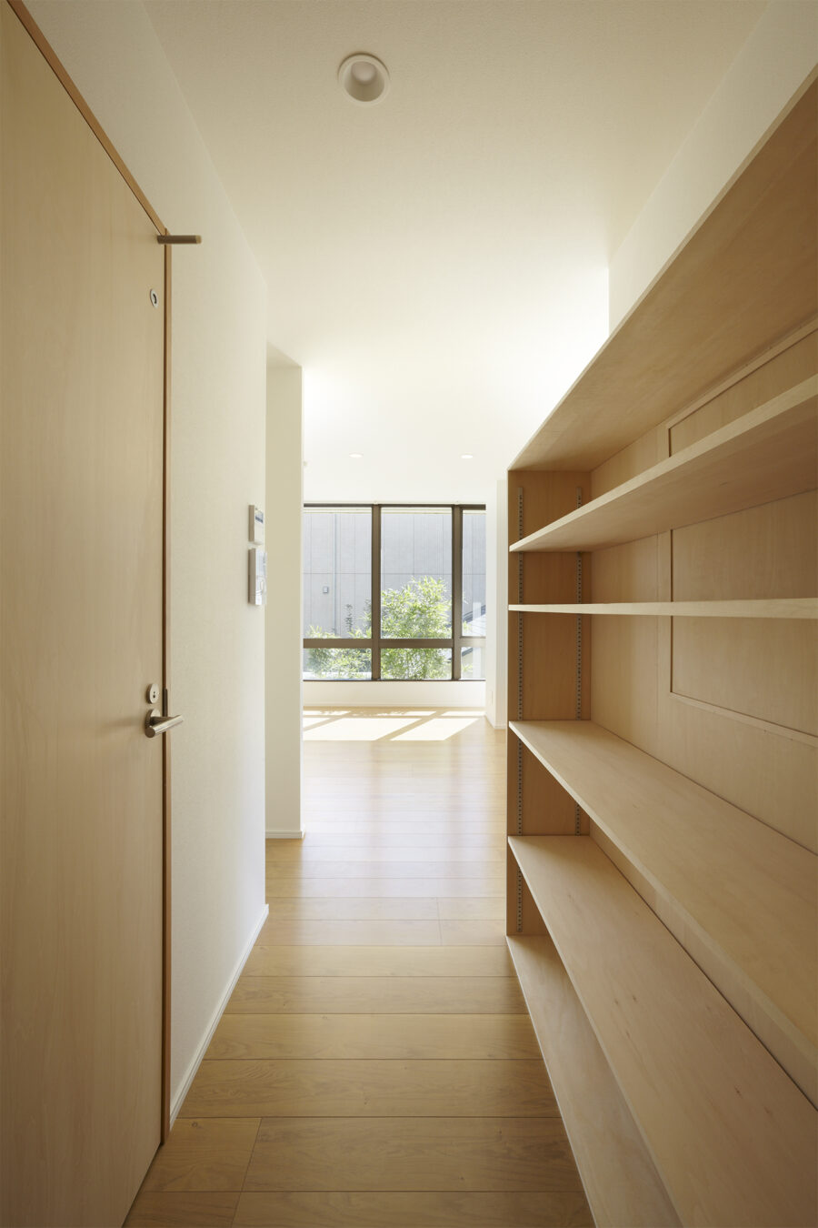 計画初期はこれらを撤去して共同住宅らしいバルコニーのある空間に変更することも考えましたが、私たちはむしろこの事務所由来の要素を残すことにしました。こうして、通常の住宅では作りえないような開放的な住まいが生まれました。