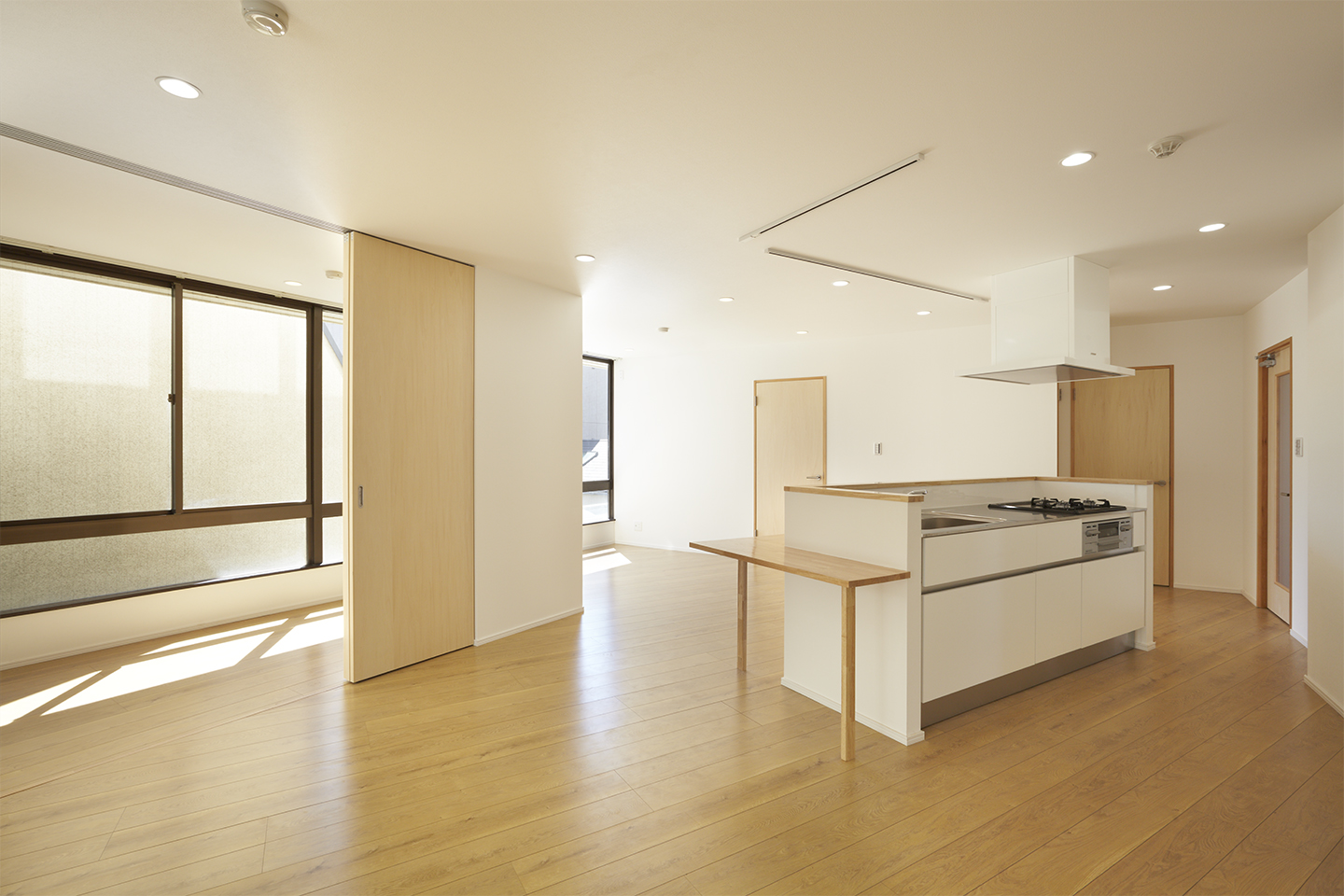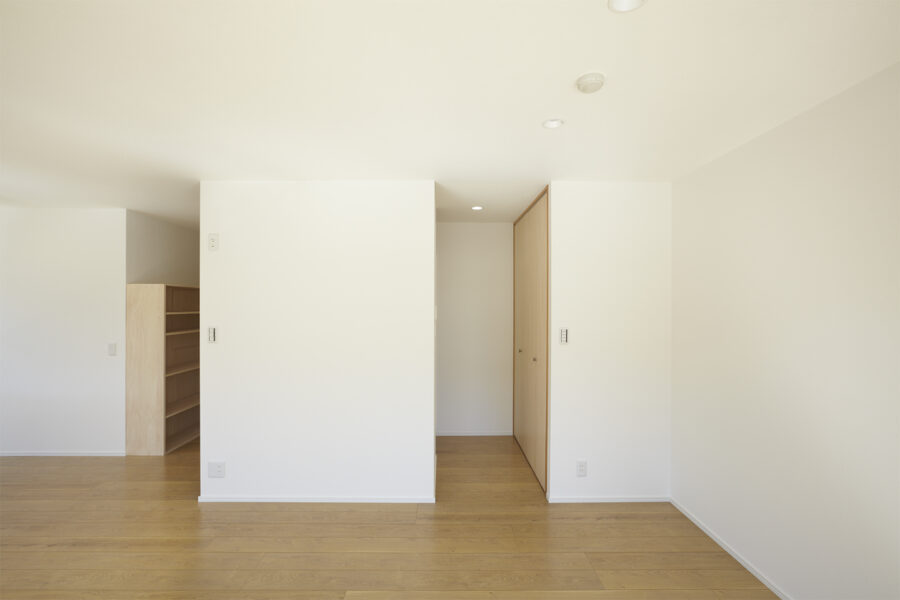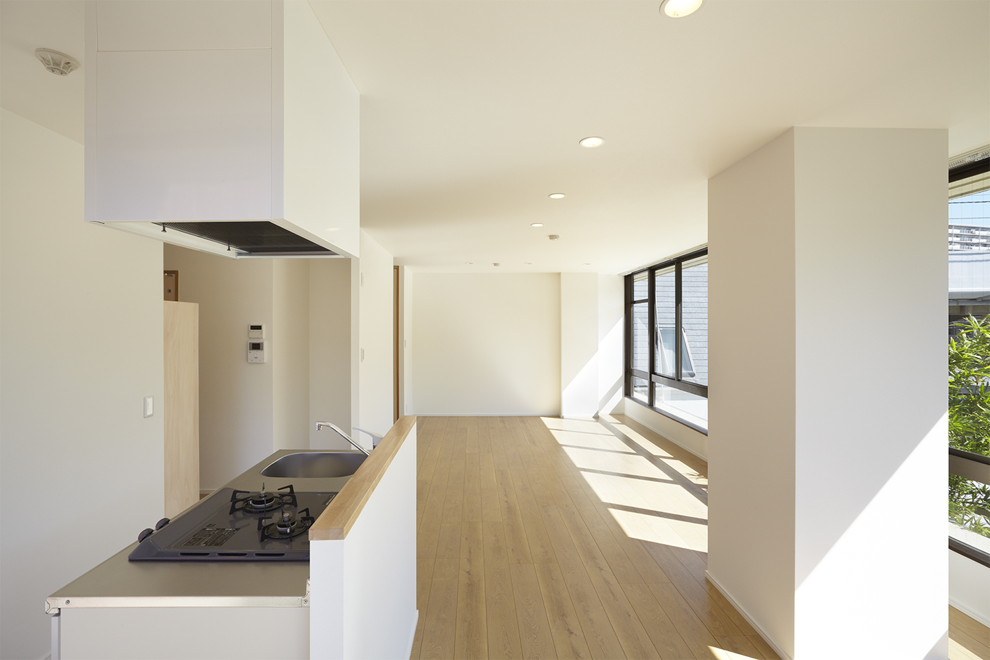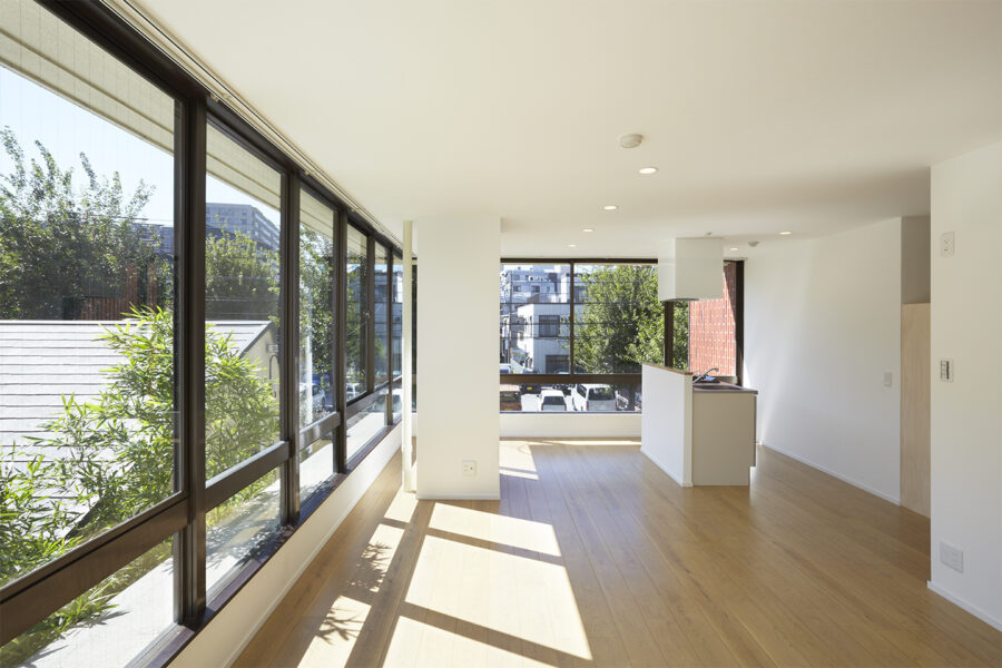 共同住宅に用途変更した2階と3階は、当初は事務所らしいつくりをしていました。具体的には、接道面の南側と低層の隣家が迫る東側で、キャンチレバーの外壁とほとんどフルハイトのサッシが開放的な空間をもたらしていました。
